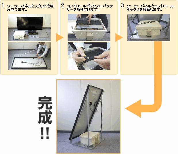 組み立て方法は下図の流れで行うだけで非常に簡単です。付属しているドライバーとスパナがあるので、工具をご自分で用意する必要もありません。まずはソーラーパネルとスタンドを組み立て、コントロールボックスにバッテリーを取り付けます。その後にソーラーパネルとコントロールボックスを接続するだけ、簡単3ステップで完成できます。